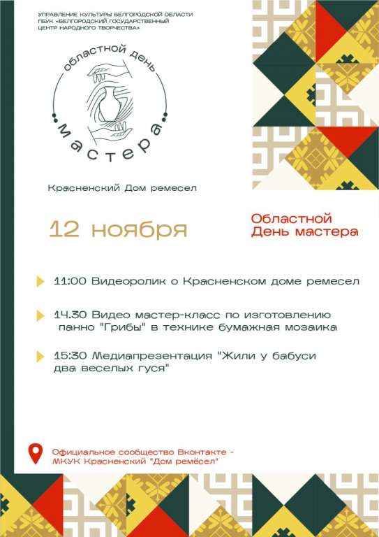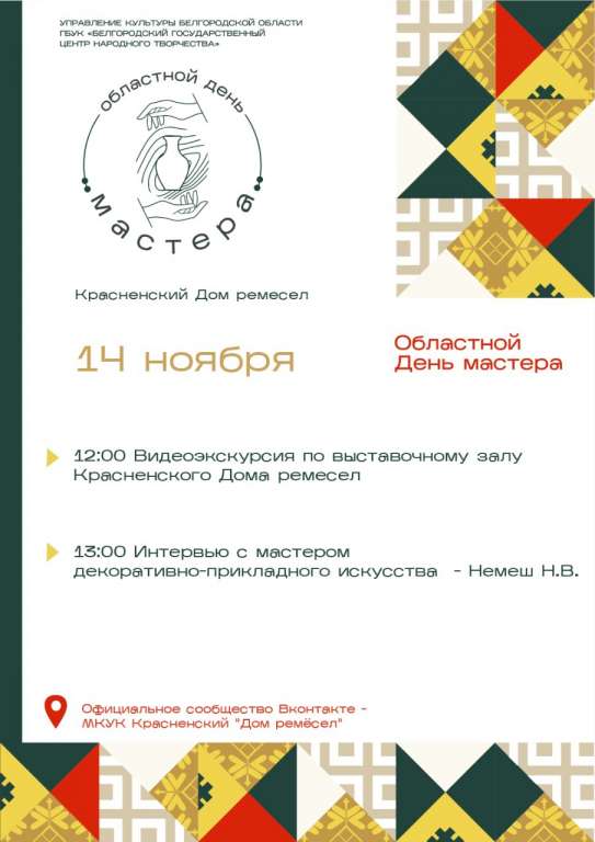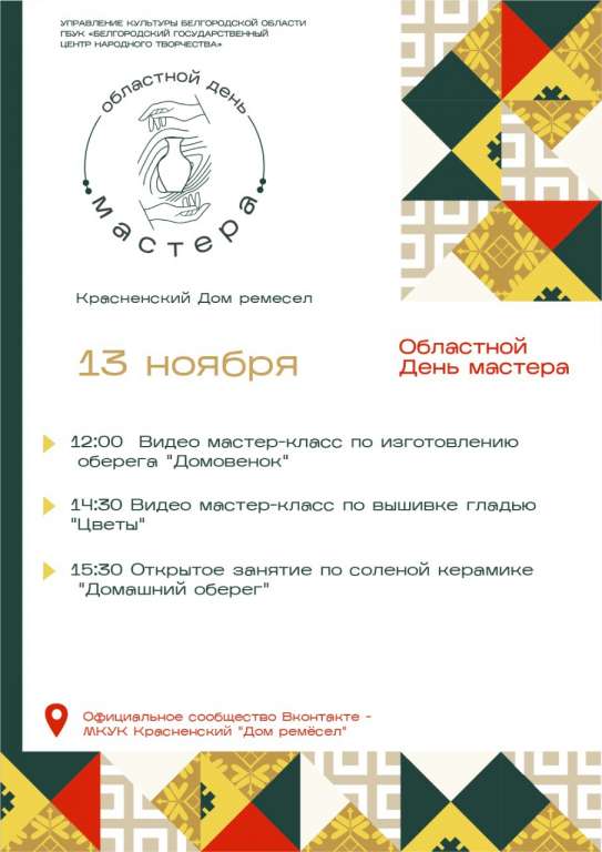С 12 по 14 ноября 2021 года МКУК "Дом ремесел" Красненского района отмечает праздник - День мастера!