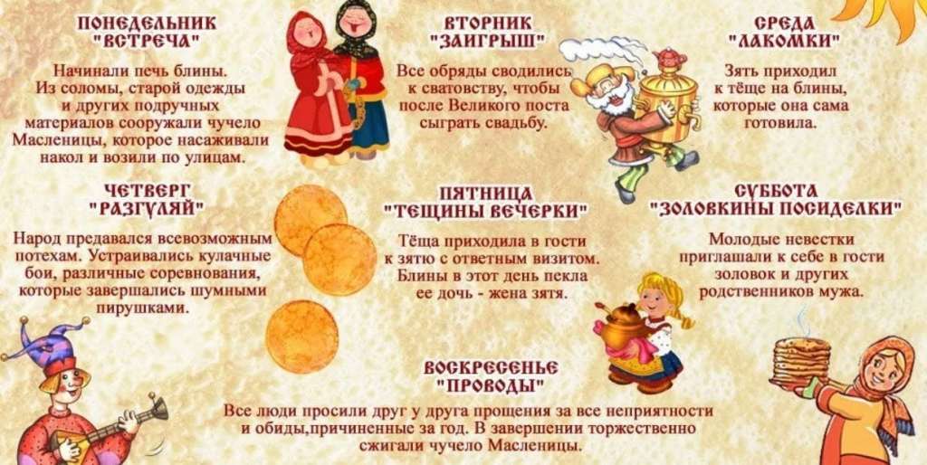 Один из самых веселых, вкусных и интересных праздников, который пришел к нам от древних славян, мы будем праздновать в этом году с 28 февраля по 6 марта. Еще с давних времен каждый день Масленицы имел определенные названия и значения. Праздничная неделя делилась на Узкую Масленицу, включающую в себя 3 первых дня, и Широкую, которой отвели оставшиеся 4 дня. В первые три дня наши предки совмещали работу и празднования, а уже во второй половине предавались массовым гуляниям. За каждым днем Масленицы были закреплены устоявшиеся обряды, которые проводились в определенной последовательности.