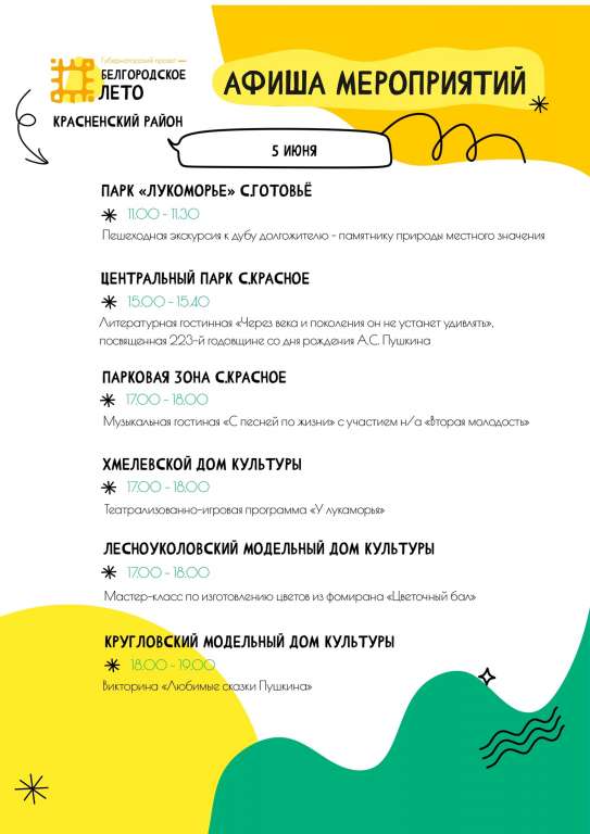 Спортивные и танцевальные праздники, экскурсии и квесты, дискотеки, концерты, лекции, кино – и все это под открытым небом! Яркие события ждут всех жителей и гостей района в рамках губернаторского проекта «Белгородское лето. Красненский район».