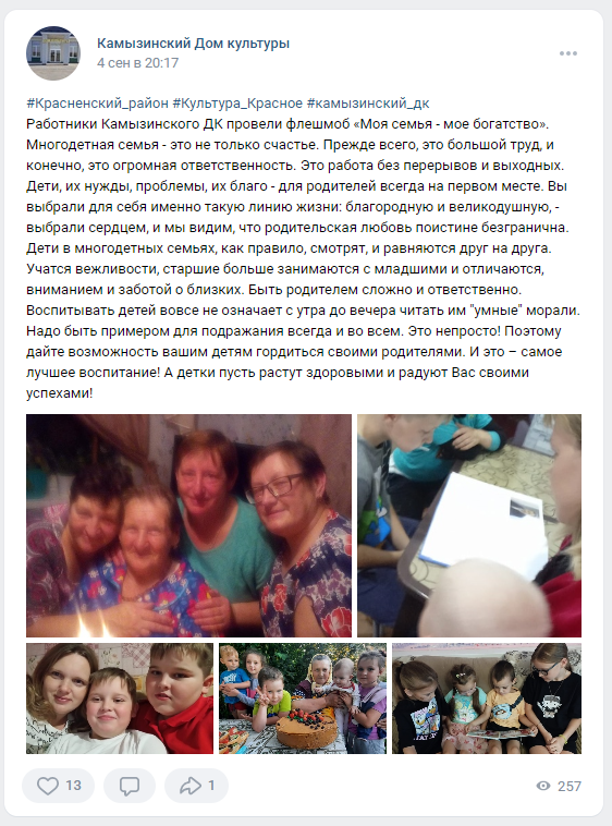 Камызинский Дом культуры Работники Камызинского ДК провели флешмоб «Моя семья - мое богатство». В социальной сети "ВКонтакте" и "Одноклассники" многодетные семьи опубликовывали фотографии из семейного архива.