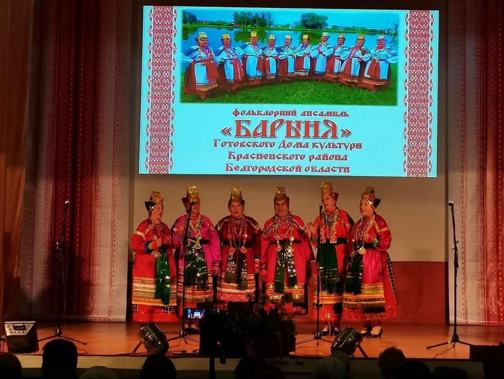 Традиционную культуру Красненского района представили народные самодеятельные коллективы – фольклорные ансамбли «Барыня» Готовского Дома культуры, «Узорочье» Лесноуколовского модельного Дома культуры, и мастер декоративно-прикладного творчества Александр Бочаров.