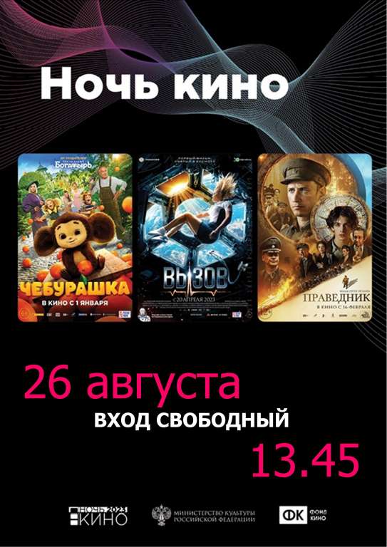 Всероссийской акции «Ночь кино – 2023» 23 Августа 2023, 10:44 26 августа для жителей и гостей района будут работать 6 площадок. По всей стране в этот день покажут самые кассовые отечественные картины 2022–2023 годов: «Чебурашка» (режиссёр Дмитрий Дьяченко, 6+) «Вызов» (режиссёр Клим Шипенко, 12+) «Праведник» (режиссёр Сергей Урсуляк, 12+)