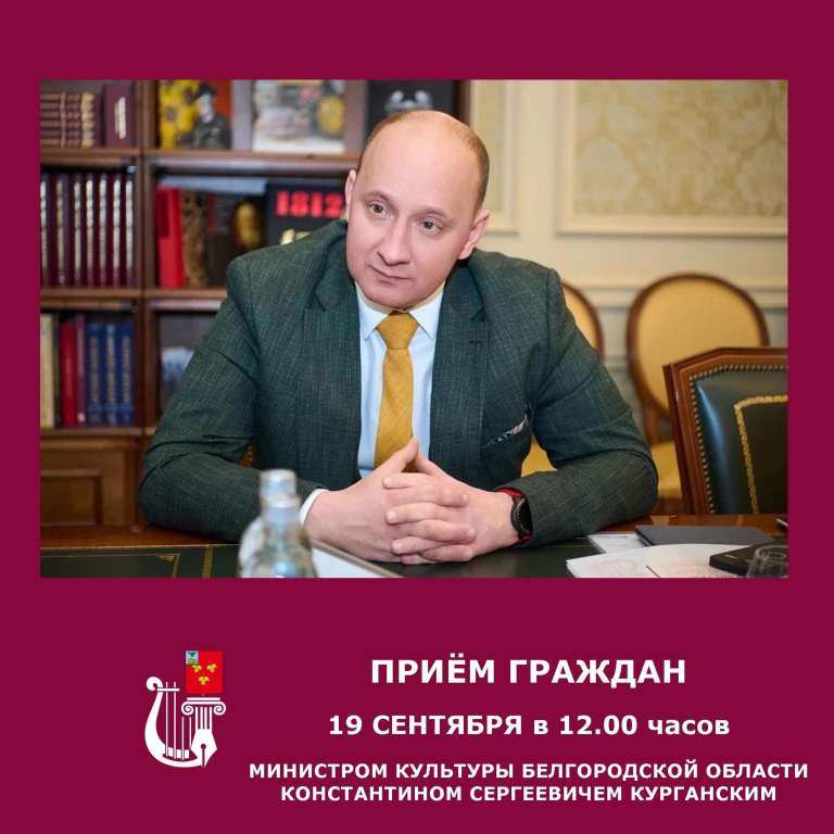 Приём граждан министром культуры Белгородской области Константином Сергеевичем Курганским 16 Сентября 2023, 15:08 19 сентября 2023 года в 12:00 часов в зале администрации Красненского района состоится приём граждан министром культуры Белгородской области Константином Сергеевичем Курганским.