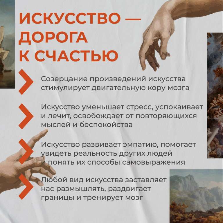 Искусство — это не только картины или музыка, также литература, театр, кино и многое другое. Мы можем любить или не любить определенные виды искусства, но они все равно оставляют след в нашей душе. Именно искусство помогает нам по-новому взглянуть на мир, понять себя и окружающих.