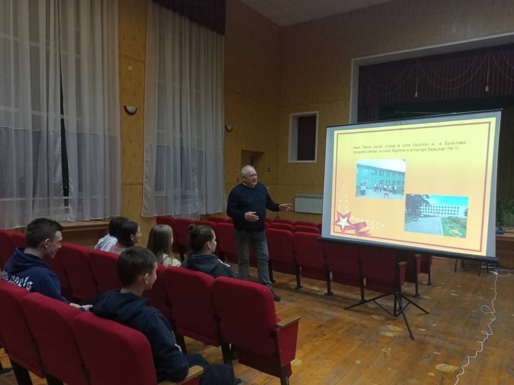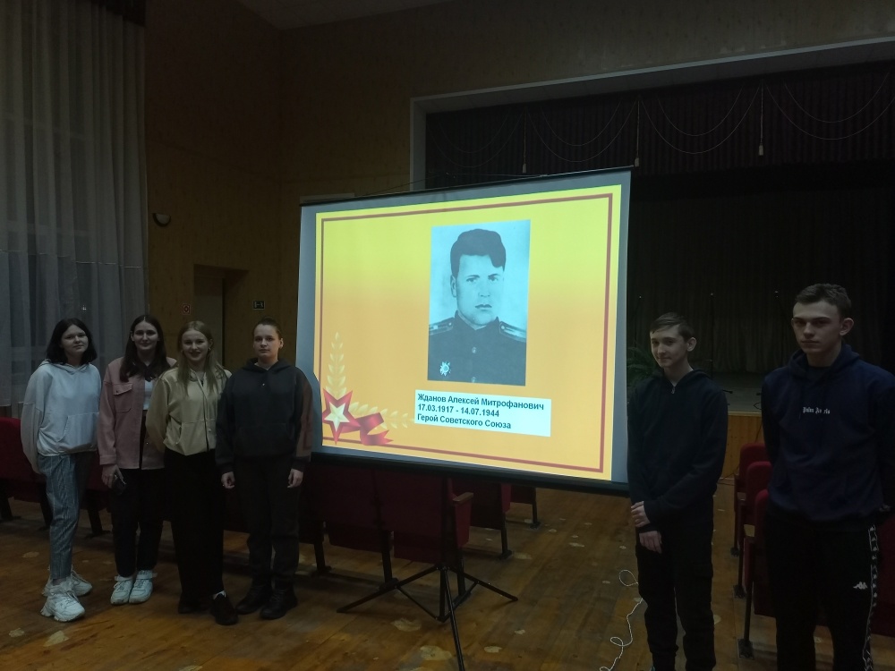 Вечер памяти, посвященный Герою Советского Союза А.М. Жданова «И помнит мир спасенный…» 19 Марта 2024, 11:52 В Доме культуры прошел вечер памяти, посвященный Герою Советского Союза А.М. Жданова «И помнит мир спасенный…» Жданов Алексей Митрофанович родился 17 марта 1917 года в с. Круглое Уколовского района (сегодня Красненский район). До войны работал учителем и заместителем директора по учебной части Большовской 7-летней школы. В 1939 году был призван в ряды Красной Армии. Командир батальона 287-го стрелкового полка 51-й стрелковой дивизии, 6-ой гвардейской армии, 1-го Прибалтийского фронта Жданов А.М. 14 июля 1944 года у деревни Бейнары Витебской области вместе с подразделением попал в окружение и занял круговую оборону. Батальон в течение нескольких часов отбивал яростные атаки врага, уничтожив 3 танка, 2 штурмовых орудия, свыше роты солдат и офицеров противника. Спасая бойцов своего батальона, лично вёл огонь из пулемёта до последнего патрона, пока не был смертельно ранен на поле боя. Во время мероприятия ведущий рассказывал о жизненном пути и подвиге Героя Советского Союза Алексея Жданова. На проекторе демонстрировались фотографии и кинохроники времен Великой Отечественной войны.