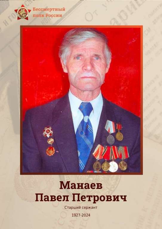 Павел Петрович Манаев призван в ряды советской Армии в школу младших командиров Брянской области в 1944 году, по окончании школы ему присвоили звание младший сержант, и в июне 1945 года Павел Петрович направлен на Дальний восток, затем, когда началась война с Японией, на Южный Сахалин для борьбы с японскими интервентами.