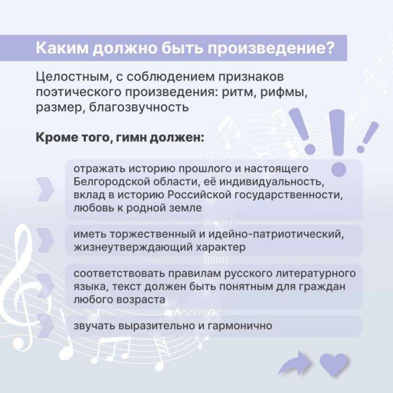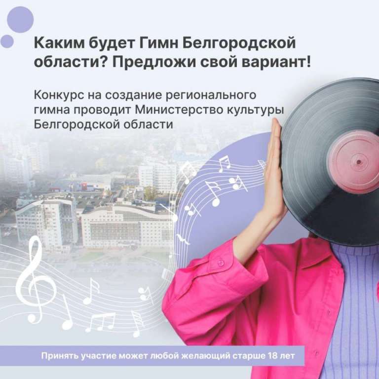 Белгородцев приглашают к созданию гимна региона 07 Мая 2024, 16:33 Белгородцев приглашают к созданию гимна региона. Конкурс проводится в два этапа: отборочный — с 18 апреля по 1 сентября, финальный — с 1 сентября по 20 октября.