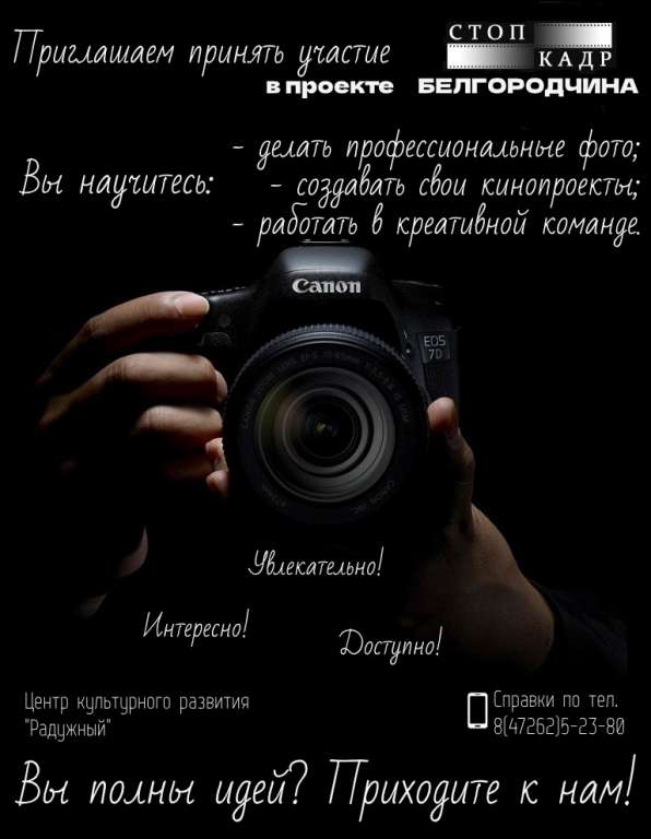 Начинаем реализацию проекта «Создание и внедрение системы развития фото- и видеотворчества на территории Красненского района«Белгородчина. СТОП КАДР».Найди новое хобби – увлекательное, полезное и интересное.