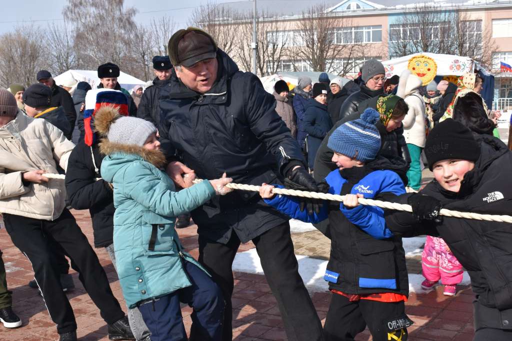 Детвора с восторгом каталась с горки и участвовала в конкурсах – кто быстрее съест блин, кто дальше кинет валенок. Взрослые же с удовольствием наблюдали за молодецкими забавами, такими как перетягивание каната и поднятие гири.