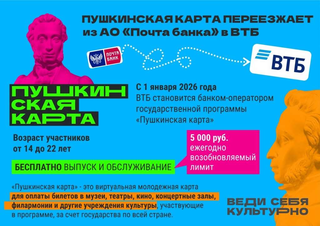3. С 15:00 1 января 2026 года ВТБ начнет выпускать и обслуживать Пушкинские карты.