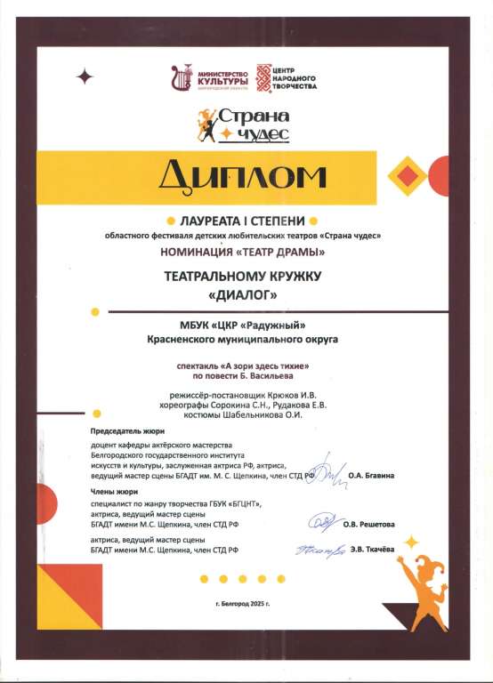 Театральный кружок «Диалог», которым руководит режиссер любительского театра Иван Крюков, одержал победу в номинации «Театр драмы». Постановка, основанная на повести Бориса Васильева «А зори здесь тихие…», покорила жюри искренностью и яркой игрой юных актеров.